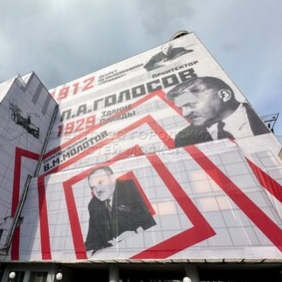 Тент с портретами политиков времен Сталина на здании бывшего комбината газеты «Правда»